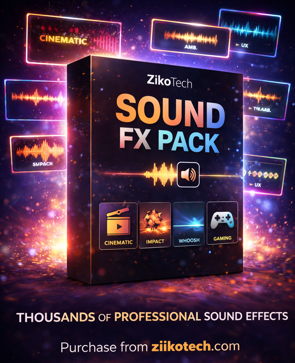The ZikoTech Sound FX Pack is a premium collection of high-quality sound effects created to bring depth, energy, and realism to your projects. From cinematic impacts and smooth whooshes to ambient sounds, UI effects, and gaming audio, this pack gives creators the tools needed to enhance storytelling and audience engagement.